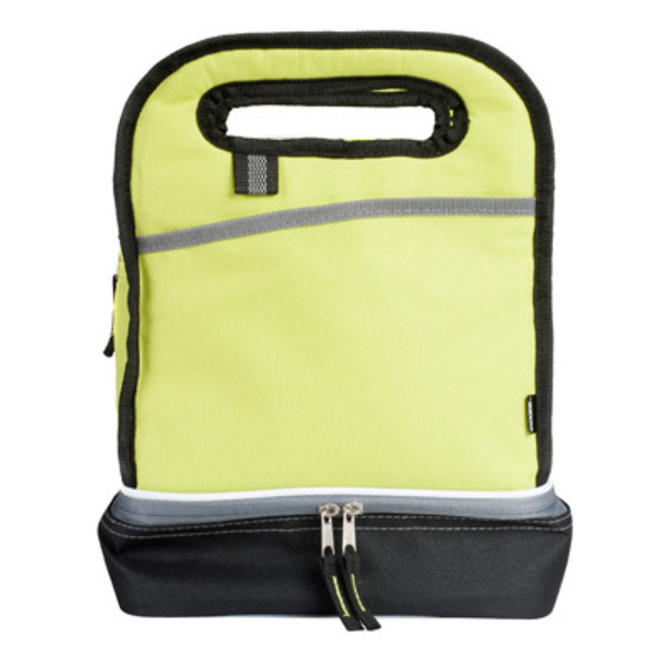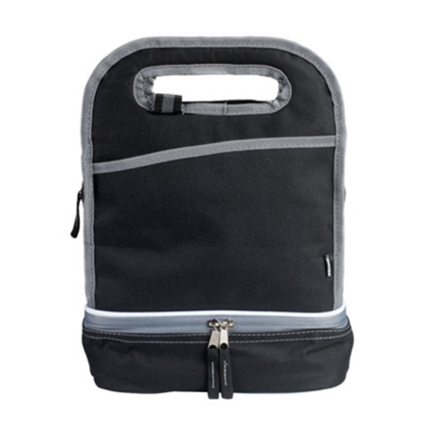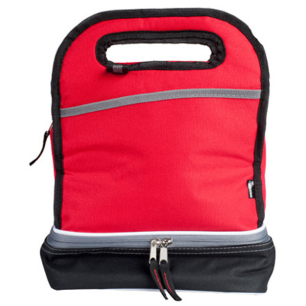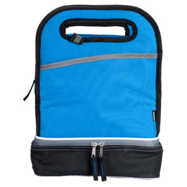 Pionowa torba termiczna z dwoma oddzielnymi pojemnikami zamykanymi na zamki błyskawiczne, przednią kieszenią i kolorystycznie dopasowanymi ciągadełkami suwaków.