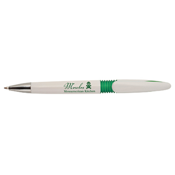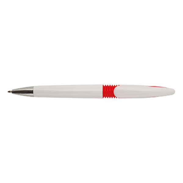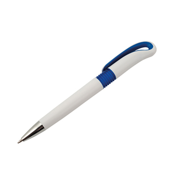 Długopis automatyczny z tworzywa sztucznego. Biały korpus, designerska wsuwka z chromowana sekcja.